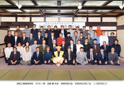 令和8年2月21日(土)土佐ノ國 二十四万石で出席者は昭和60年~63年卒・平成1年~9年卒47名、同窓会3名、総50名の参加者でした。花束・お祝いの品贈呈、記念集合写真を撮影後、ラクビー部OB会長松木氏から挨拶、現ラクビー部の活動報告があり、続いて同窓会北川会長から祝辞を述べました。会食・歓談会に移り乾杯のご発声は、昭和60年機械科卒同窓会副会長中野耕喜氏が音頭をとりました。歓談中、ラクビー部歴代の主将がお祝いの言葉を述べました。包國先生は教え子と杯を交わし歓談をしておりました。
