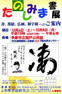 書道の普及活動の一環として肩肘張らない作品を中心に展示してまいりました「たのしみま書展」は、主催者の地元東京都多摩市で今年15回目を迎えます。近郊にお住まいの方でお近くにお越しの折には是非覗いてください。